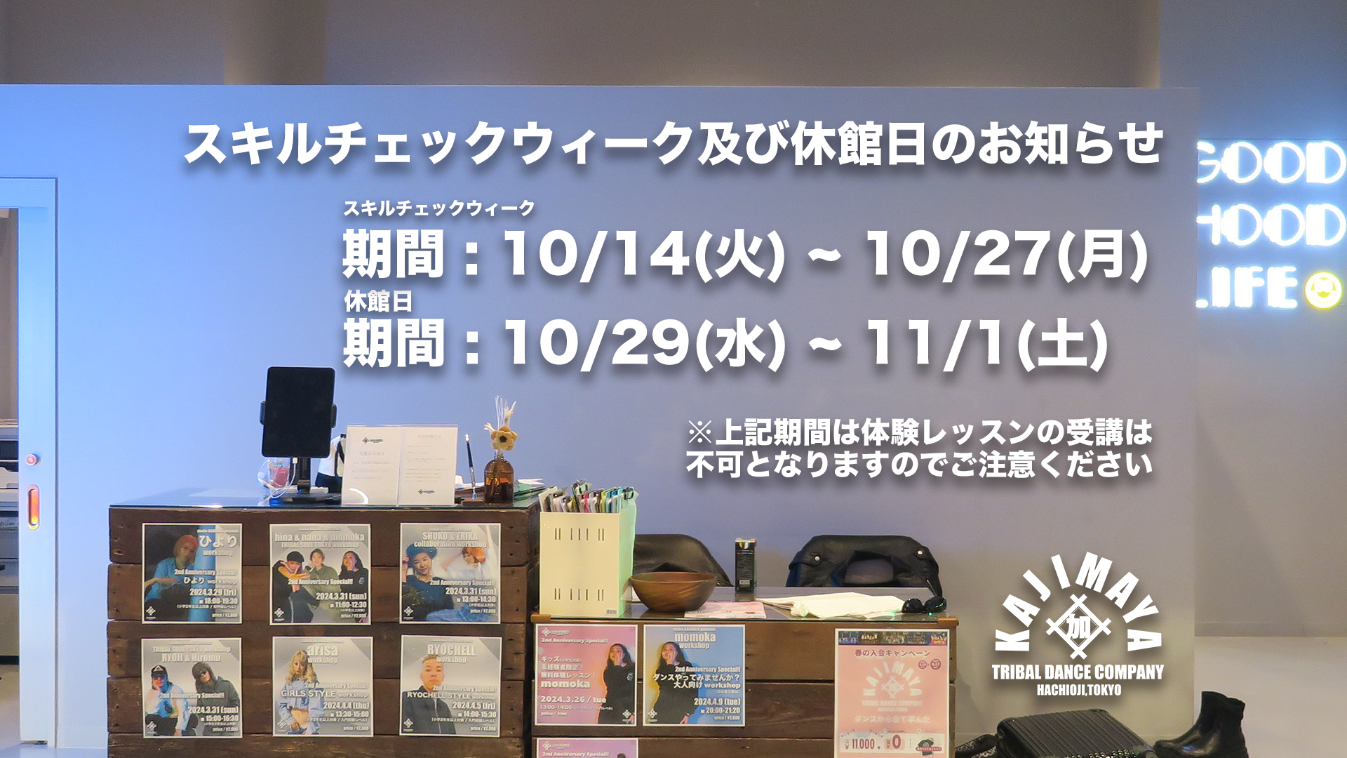 受講生の皆さまと、体験やご入会を検討されている方に、スキルチェックウィーク期間による体験受講の不可と休館日のお知らせです!
